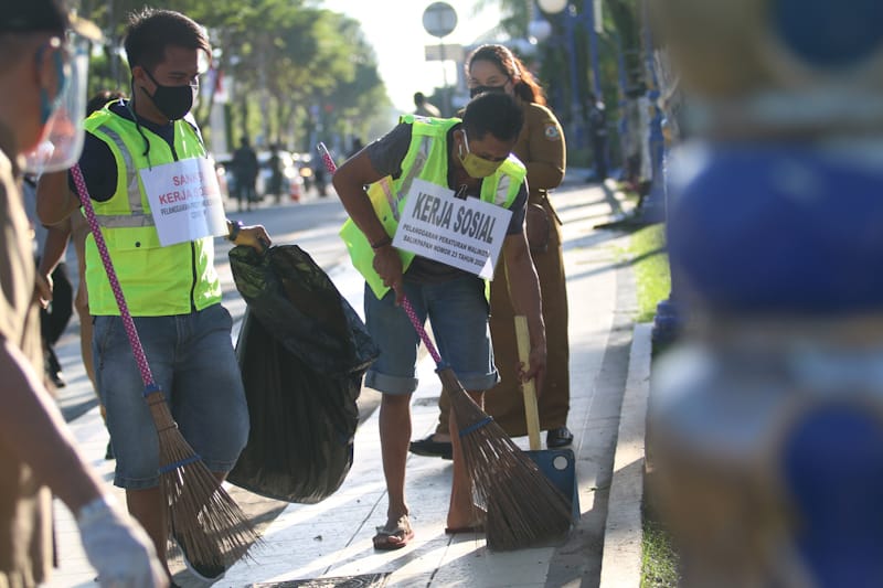 BERSIH-BERSIH: Sejumlah warga yang melanggar protokol kesehatan memilih menyapu di Balai Kota Balikpapan kemarin. Sanksi itu diterapkan setelah mereka kedapatan tidak mengenakan masker.ANGGI PRADITHA/KALTIM POST