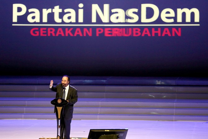 Ketua Umum Partai Nasdem Surya Paloh berpidato pada Perayaan Ulang Tahun ke-8 Partai nasdem di JIExpo, Jakarta, Senin (11/11/2019). Acara tersebut sekaligus penutupan Kongres ke-II Partai Nasdem. Foto: Dery Ridwansah/ JawaPos.com