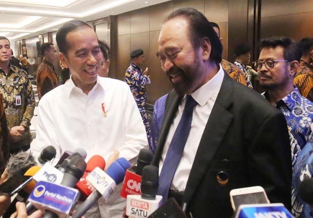 Presiden Joko Widodo dan Ketua Nasdem Surya Paloh memberikan keterangan kepada wartawan saat menghadiri acara Ultah Ke-8 dan Penutupan Kongres II Partai Nasdem di Jiexpo, Jakarta, Senin (11/11/19). FOTO : FEDRIK TARIGAN/ JAWA POS