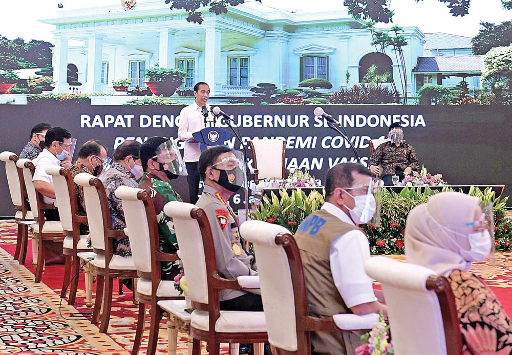 KOORDINASI: Presiden Joko Widodo saat rapat penanganan pandemi Covid-19 dan rencana pelaksanaan vaksinasi melalui virtual di Istana Negara, Jakarta, kemarin (6/1). (KRIS/SETPRES)