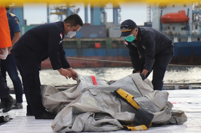 Petugas Basarnas memeriksa benda yang diduga serpihan dari pesawat Sriwijaya Air SJ 182 rute Jakarta - Pontianak yang hilang kontak di perairan Pulau Seribu, di Dermaga JICT, Jakarta, Minggu (10/1/2021). Pesawat Sriwijaya Air SJ 182 yang hilang kontak pad