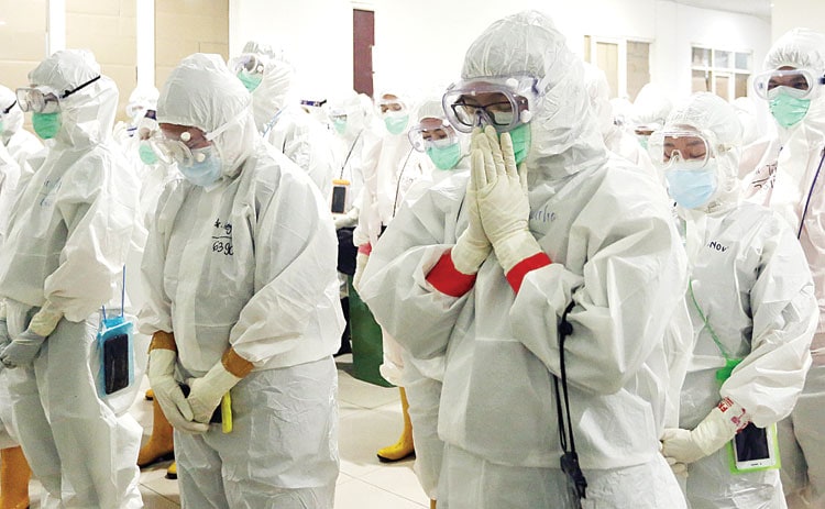 GARDA TERDEPAN: Sejumlah tenaga kesehatan berdoa sebelum bertugas di RS Darurat Covid-19 Wisma Atlet Kemayoran, Jakarta, kemarin (26/1). (SALMAN TOYIBI/JAWA POS)