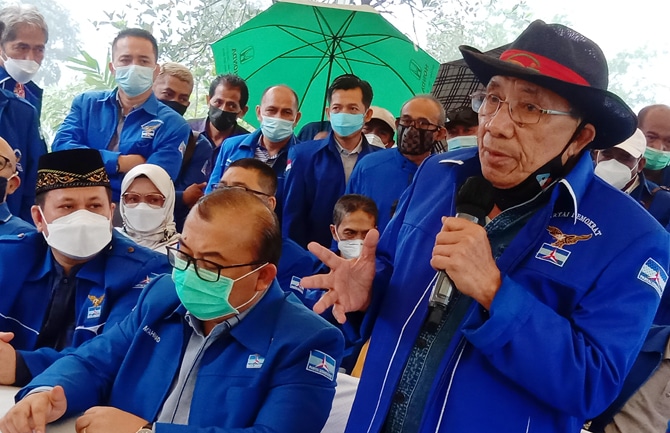 Ketua Dewan Kehormatan Partai Demokrat versi KLB Sumut, Max Sopacua bersama Jubir Partai Demokrat versi KLB Sumut, Rahmad memberikan keterangan kepada wartawan saat konferensi pers di Bukit Hambalang, Kabupaten Bogor, Jawa Barat, Kamis (25/3/2021). Dalam