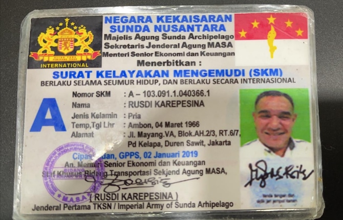 JawaPos.com - Pengemudi mobil Mitubishi Pajero Sport bernomor plat SN 45 RSD, Rusdi Karepesina, 55, menyebut jika pimpinan Negara Kekaisaran Sunda Nusantara adalah warga Depok, Jawa Barat. Sang pimpinan itu bernama Alex Ahmad Hadi Ngala. Dia berstatus sebagai Panglima Majelis Agung Archipelago.