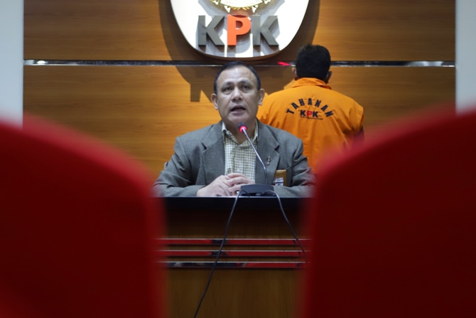 Ketua Kpk Firli Bahuri saat jumpa pers terkait tersangka kasus suap terhadap penyidik KPK, Sabtu (24/4/2021). Syahrial dijadikan tersangka lantaran diduga kuat telah menyogok penyidik KPK, Stepanus Robin Pattuju, senilai Rp1,5 miliar. Syahrial menyuap Rob