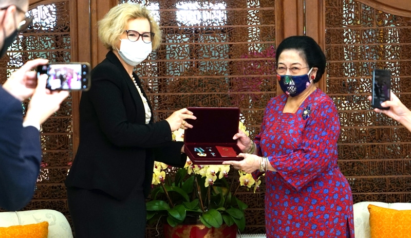 ERAT: Megawati Soekarnoputri (kanan) menerima penghargaan dari Presiden Rusia yang diserahkan Dubes Rusia Lyudmila Vorobieva di kediamannya kemarin (2/6). (HUMAS DPP PDIP)