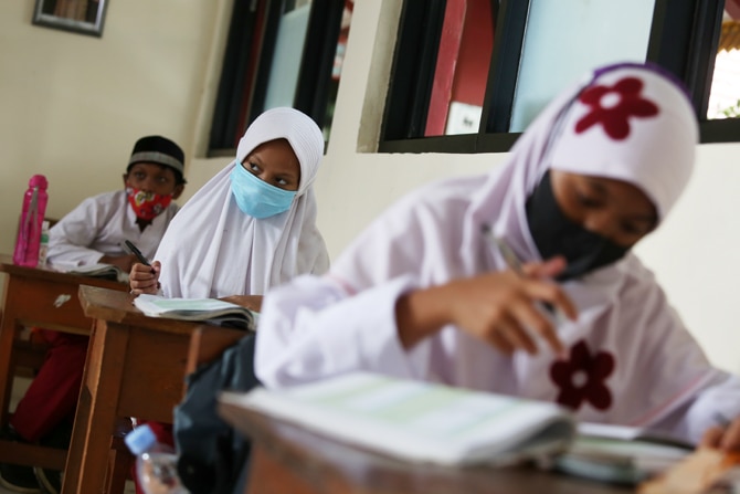 Sejumlah siswa saat melakukan belajar tatap muka di SDN Pondok Labu 14 Pagi di Cilandak, Jakarta Selatan, Jumat (04/06/2021). Kegiatan belajar tatap muka ini diikuti 50 persen dari total siswa untuk setiap kelas guna mengantisipasi penyebaran virus Covid-