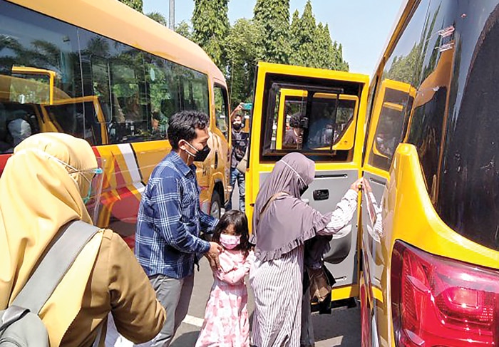 KE TEMPAT ISOLASI: Seorang ASN bersama anggota keluarga masuk ke bus sekolah milik Dishub Kudus menuju Asrama Haji Donohudan, Boyolali, kemarin. (AKHMAD NAZARUDDIN LATHIF/ANTARA)