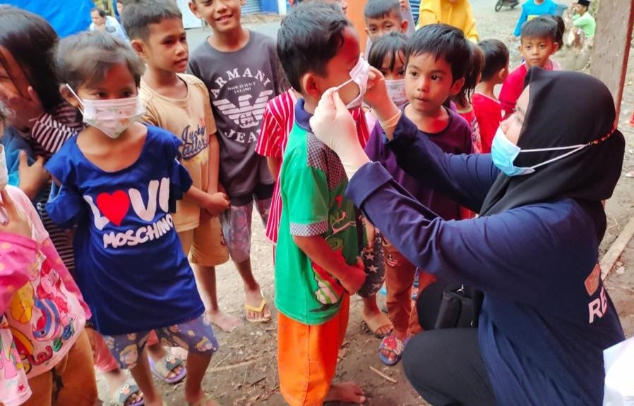 Sejumlah anak mendapatkan masker gratis dari Aice yang bekerja sama dengan GP Ansor dan KSP. foto: Istimewa