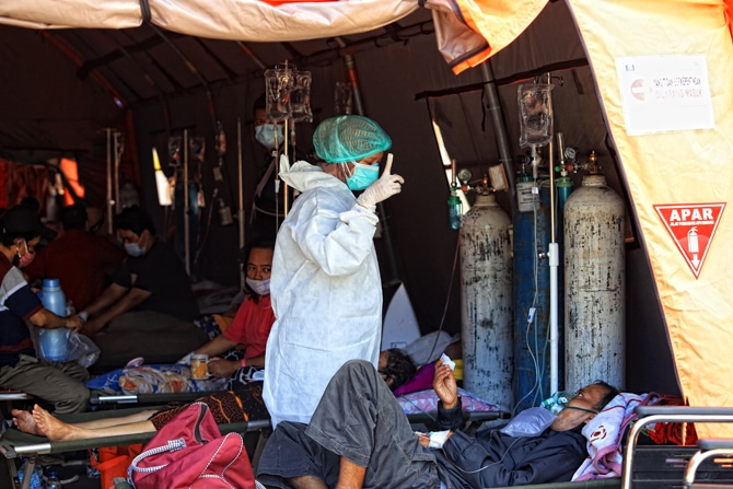 Pasien menjalani perawatan di tenda darurat yang dijadikan ruang IGD (Instalasi Gawat Darurat) di RSUD Bekasi, Jawa Barat, Sabtu (26/6/2021). Kasus COVID-19 di Indonesia masih terus melonjak sampai saat ini. Per Sabtu (26/6/2021) ini, kasus baru harian CO