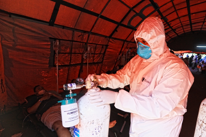 Tenaga medis saat menyiapkan tabung oksigen di tenda darurat yang dijadikan ruang IGD (Instalasi Gawat Darurat) di RSUD Bekasi, Jawa Barat, Sabtu (26/6/2021). Kasus COVID-19 di Indonesia masih terus melonjak sampai saat ini. Per Sabtu (26/6/2021) ini, kas - Image