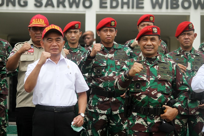 Menteri Sosial RI Ad Interim Muhadjir Effendy, bersama Danjen Kopassus Mayor Jenderal TNI Mohamad Hasan saat memimpin apel kesiapsiagaan Taruna Siaga Bencana (Tagana) bersama Komando Pasukan Khusus (Kopassus) dalam menghadapi dampak La Nina di Markas Ko