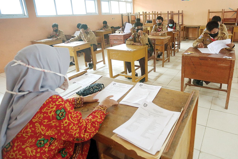 JAGA JARAK: Siswa SMAN 1 Kaur, Bengkulu, mengikuti ujian semester secara tatap muka kemarin (3/12). Pemerintah merencanakan pembelajaran tatap muka dimulai pada Januari 2021. (SALMAN TOYIBI/JAWA POS)