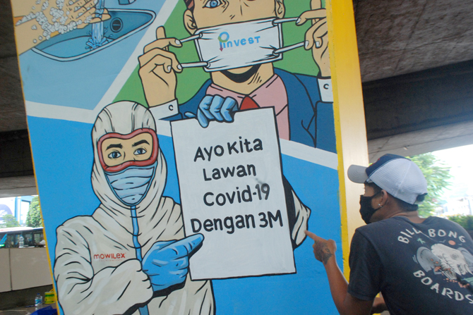 Mural imbauan untuk melawan COVID-19 menghiasi bawah kolong tol kawasan Tomang, Jakarta, Kamis (10/12/2020). Mural tersebut merupakan salah satu upaya untuk mengajak masyarakat agar selalu menerapkan protokol kesehatan. Foto: Dery Ridwansah/ JawaPos.com