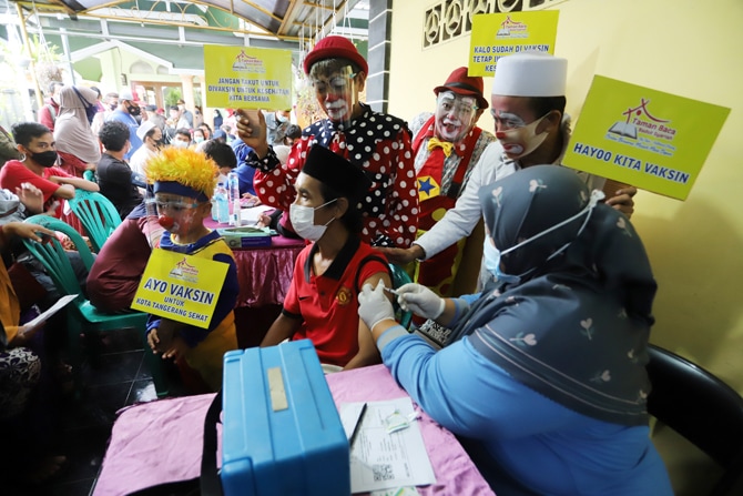 Sejumlah badut badut ikut meramaikan sosialisasi vaksinasi tingkat RW di kawasan Sudimara, Pinang, Kota Tangerang, Selasa (14/9/2021). Aksi para badut yang menghibur ini mengajak masyarakat untuk ikut menjalani vaksinasi Covid-19. Foto: Dery Ridwansah/ Ja