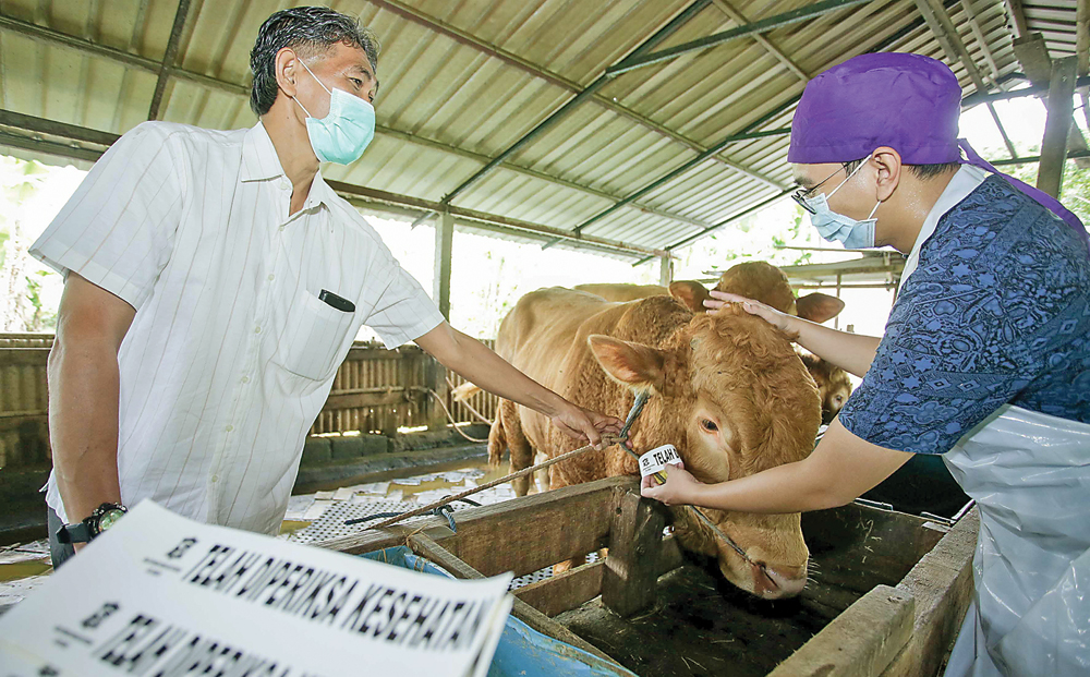 ANTISIPASI: Tim Dinas Ketahanan Pangan dan Pertanian memberikan stiker pada sapi yang telah diperiksa di kawasan Pakal, Surabaya, kemarin (11/5). (ALFIAN RIZAL/JAWA POS)
