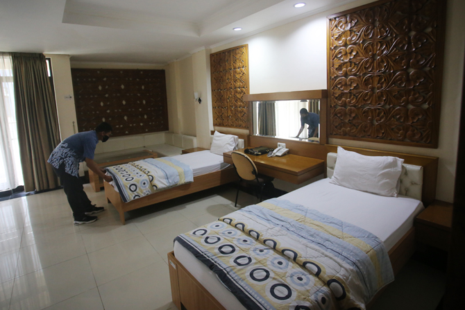 Petugas merapikan kamar untuk jemaah umrah di Asrama Haji, Pondok Gede, Jakarta Timur, Rabu (1/12/2021). Kementerian Agama menyiapkan Asrama Haji Pondok Gede sebagai tempat karantina jemaah umrah dan akan menerapkan kebijakan satu pintu pemberangkatan jem