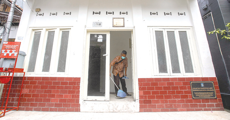 JEJAK AWAL: Seorang penjaga rumah kelahiran Soekarno di Surabaya sedang bersih-bersih kemarin (5/6). (DIPTA WAHYU/JAWA POS)