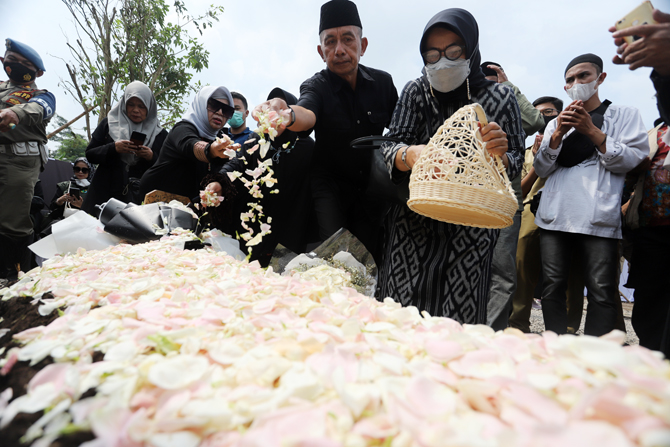 Warga Saat menabur bunga di makam Emmeril Kahn Mumtadz alias Eril di Cimaung, Banjaran, Kabupaten Bandung, Senin (13/6). Kang Emil sapaannya mengatakan berterima kasih kepada semua pihak yang telah membantu proses pemulangan jenazah putranya hingga dimak