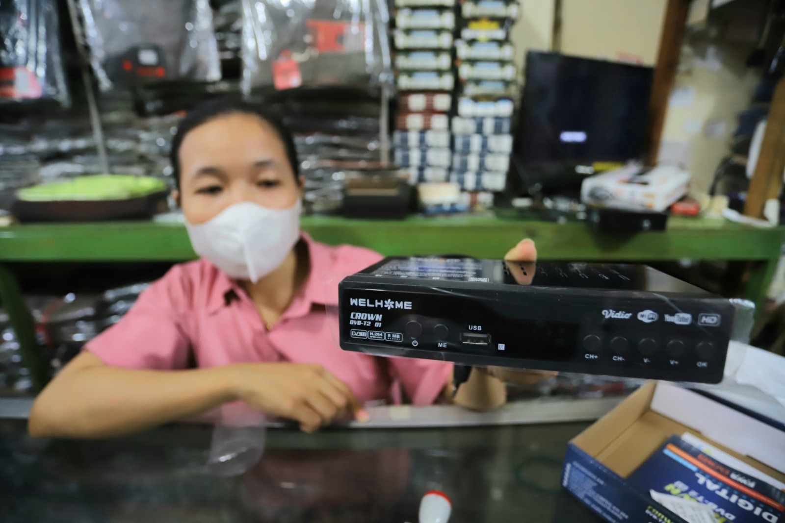 Pedagang melayani pembeli set top box (STB) TV Digital di pusat elektronik Pasar Kebayoran Lama, Jakarta, Jumat (4/2/2022). Hari pertama migrasi tv analog ke tv digital membuat penjualan STB meningkat pesat. Bahkan sudah sejak 2 minggu sebelum migrasi s