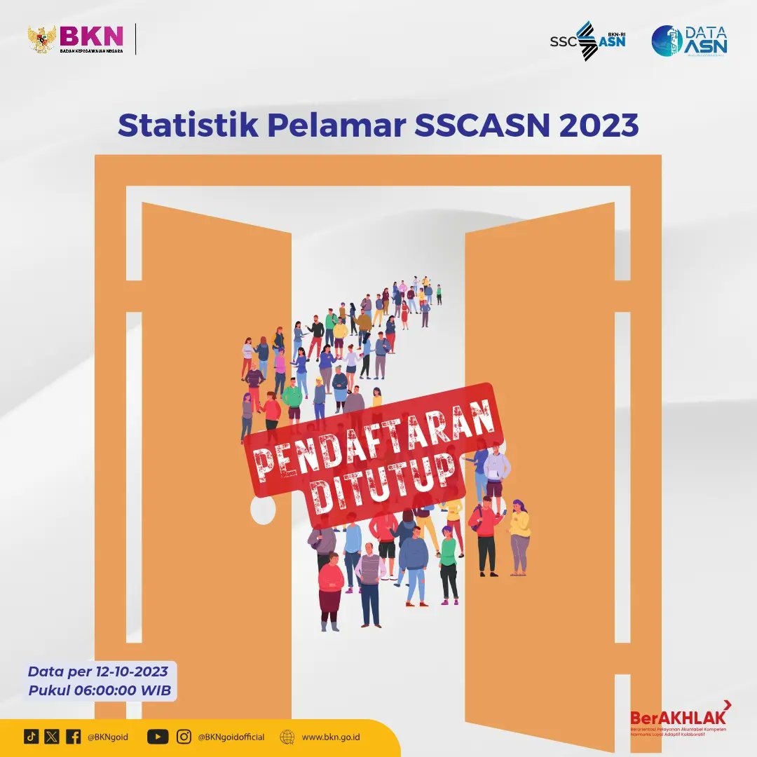 Melalui akun media sosial Instagram dan X resmi mereka, BKN mempublikasikan statistik pelamar pada Sistem Seleksi Calon Aparatur Sipil Negara (SSCASN) 2023.