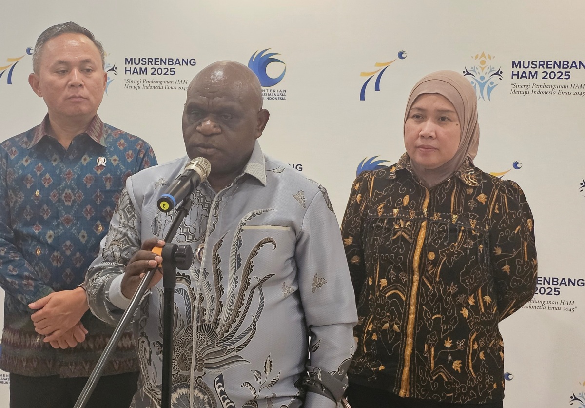 Menteri Hak Asasi Manusia (HAM) Natalius Pigai (kedua kiri) berbincang dengan anggota DPR RI Fraksi PKB, Prana Putra Sohe (kanan) disela rapat kerja dengan komisi XIII di Kompleks Parlemen Senayan, Jakarta, Rabu (5/2/2025). (Salman Toyibi/Jawa Pos)
