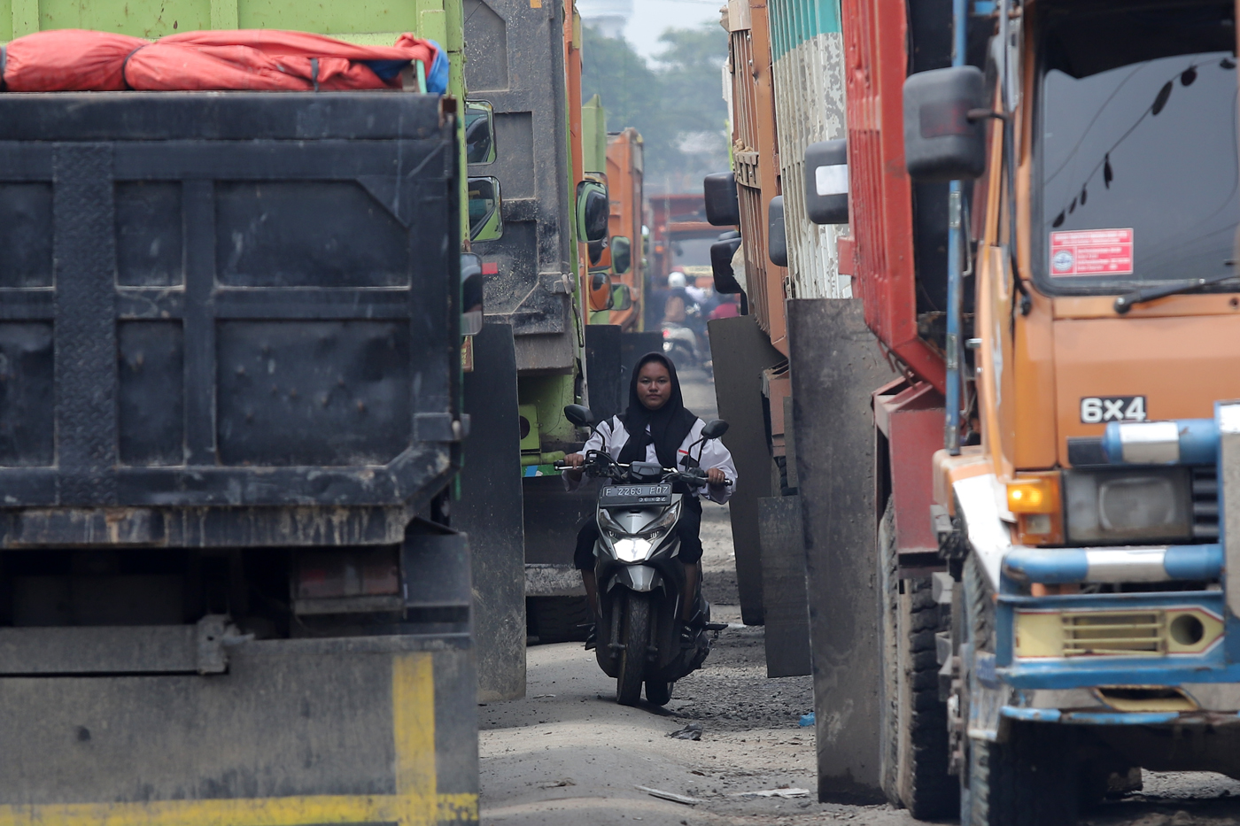 Pegendara sepeda motor melewati jalan yang terhimpit di antara dua badan truk yang antre melintas di Jalan Raya Parung Panjang, Bogor, Jawa Barat, Sabtu (9/12/2023). Kemacetan imbas dari sejumlah sopir truk berunjuk rasa terkait jam operasional truk tamb