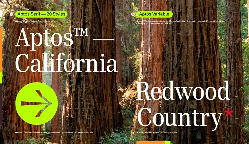 Aptos, font sans serif dengan elemen tipografi Swiss abad ke-20, menampilkan ujung batang yang rapi dan kotak melingkar halus di dalam kontur huruf, meningkatkan keterbacaan pada ukuran kecil.