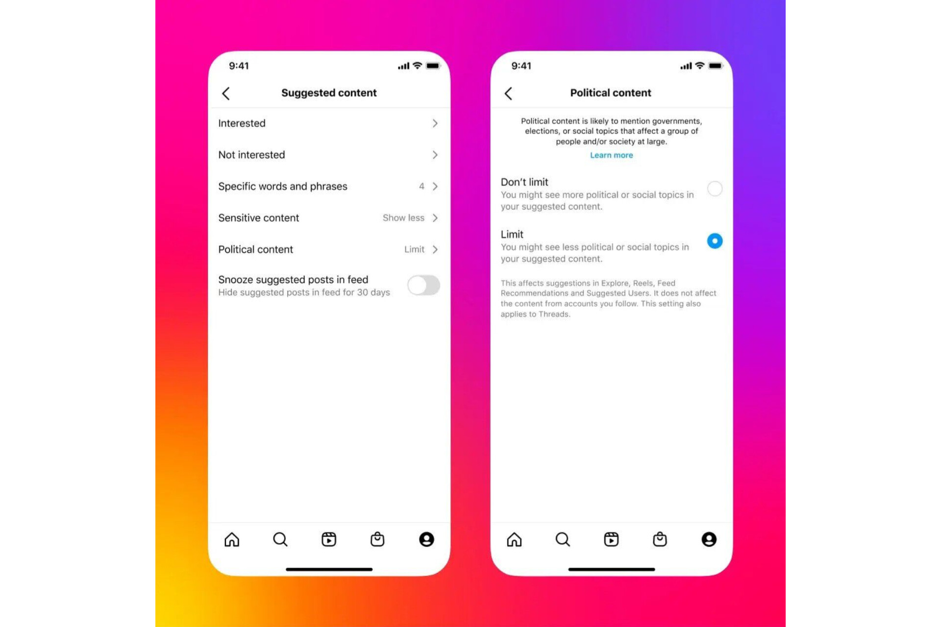 Bagi mereka yang masih ingin mendapatkan informasi mengenai isu-isu pemerintahan, pemilu, atau sosial, pilihannya tetap terbuka. Pengguna dapat mengubah pengaturannya agar pintu ini tetap terbuka, hanya memengaruhi konten dari akun publik di bagian yang direkomendasikan seperti Jelajahi dan Reel.