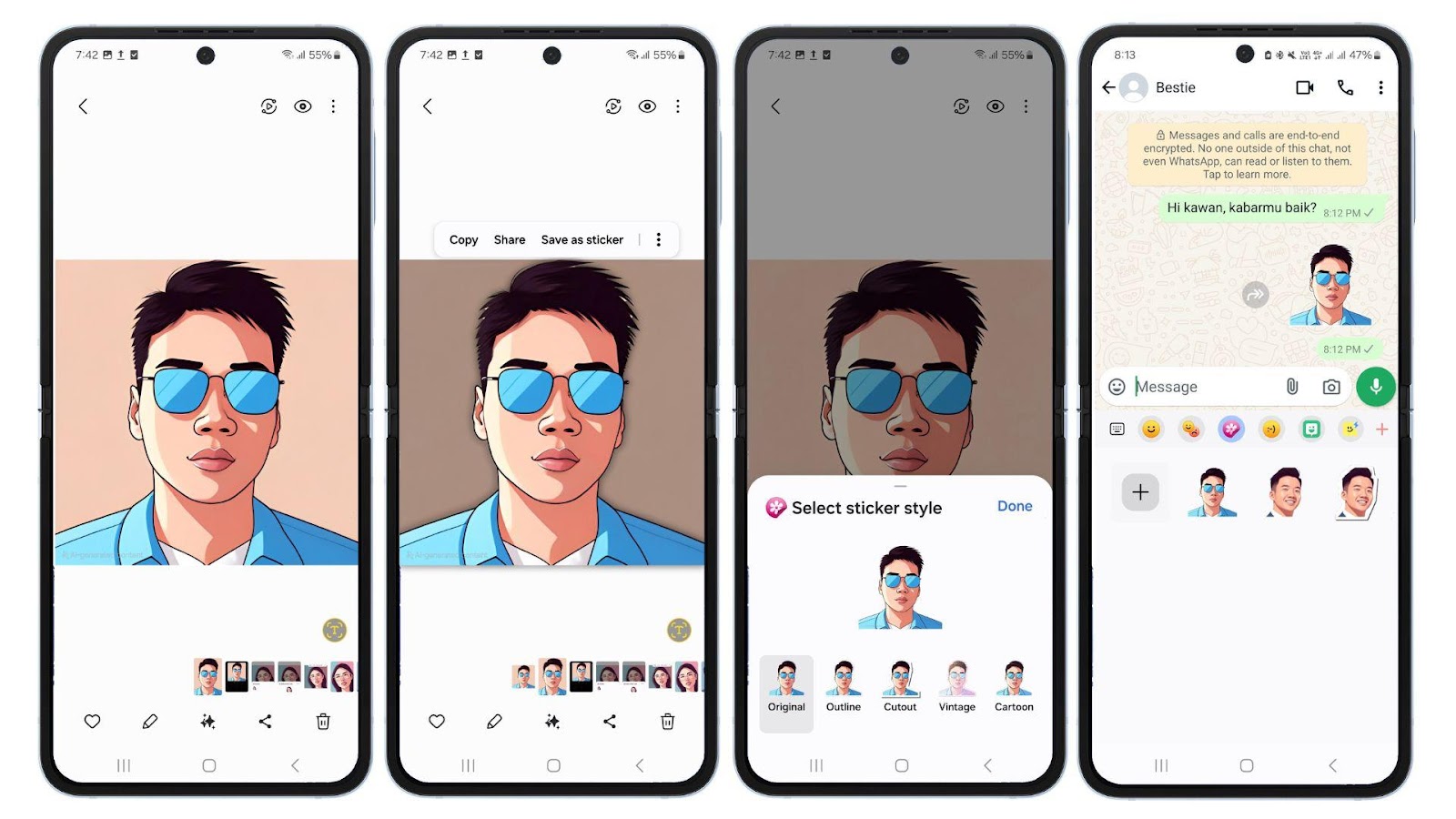 Jadi, tak heran sekarang masih banyak orang menggunakan avatar AI, termasuk sebagai profile picture di WhatsApp. Kalau sebelumnya kita harus mengunduh aplikasi atau pakai situs web tertentu untuk bikin avatar AI, sekarang kita bisa mendapatkannya dengan lebih praktis menggunakan fitur Portrait Studio di Galaxy AI yang ada di Galaxy Z Fold6 dan Z Flip6.