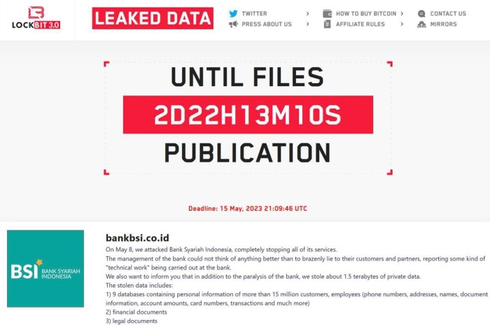 Dia menambahkan, saat ini LockBit ransomware juga menebar ancaman. Jika dalam tiga hari BSI tidak membayarkan uang tebusan, mereka akan menyebarkan 15 juta data nasabah yang diklaim telah mereka kuasai. "Waktunya sedang dihitung mundur," tulis akun tersebut.