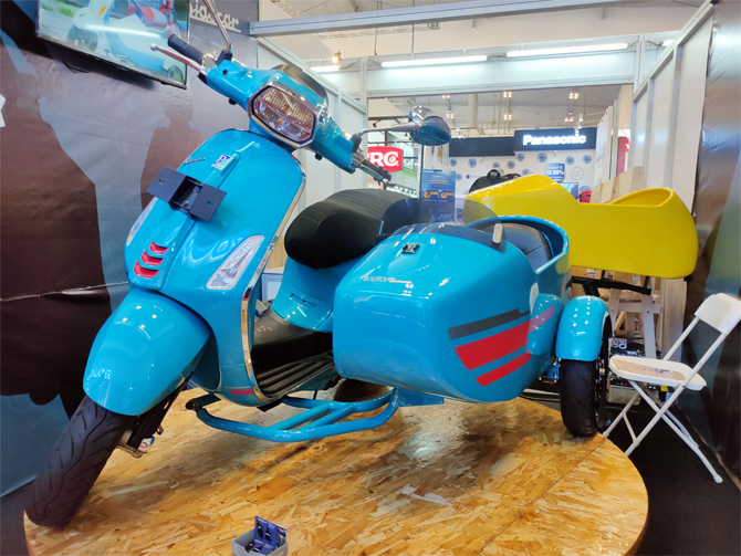 MAF Sidecar, misalnya. Berawal dari iseng-iseng, Alwi, mahasiswa semester tujuh Universitas Pasundan, Bandung ini sukses membuat sespan untuk Vespa matik miliknya dan mulai memasarkannya di GIIAS 2022. Di pameran ini, buat yang mau Vespa-nya tampil beda dan lebih keren, bisa dipasangi sespan.