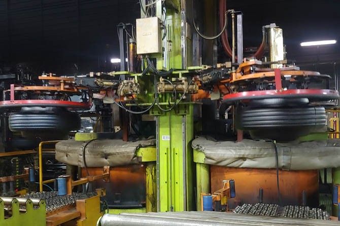 Proses pencetakan tapak ban, pattern atau ulir ban di mesin ber suhu 270 derajat. (Rian Alfianto/JawaPos.com)