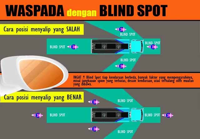 Bukan hanya pengendara truk atau mobil saja yang harus waspada, namun juga pengendara sepeda motor harus mengenal titik-titik dimana area blind spot mereka. Hati-hati jadilah pelopor keselamatan di jalan raya.