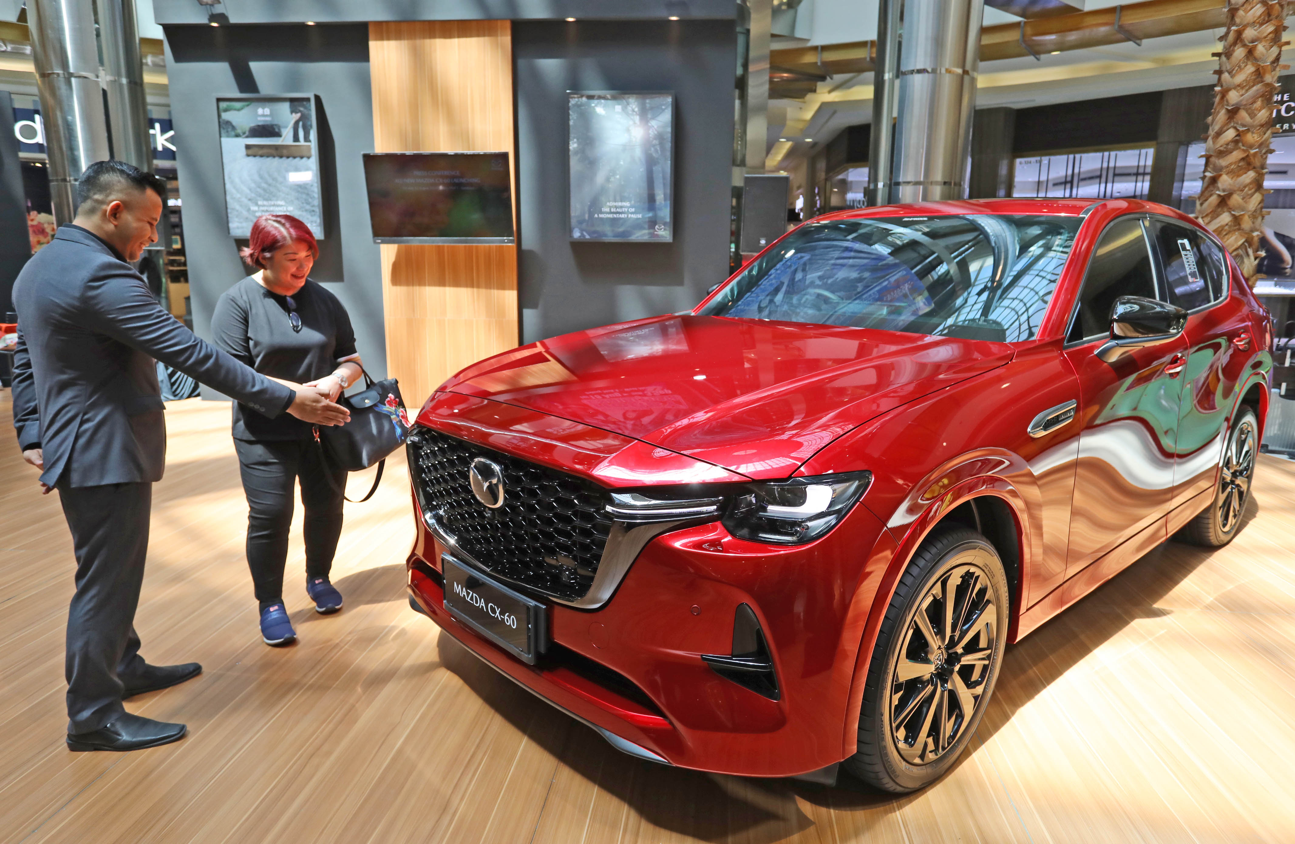 Salah seorang pengunjung pameran saat melihat premium SUV All New Mazda CX-60 usai launching di Atrium West Galaxy Mall Surabaya. Jatim berkontribusi 8 persen terhadap penjualan mobil premium, produsen terus kenalkan produk baru ke wilayah tersebut. Selas