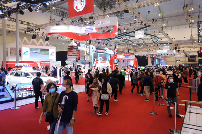 Pengunjung mengantre untuk masuk ke ruang pamer mobil Honda pada ajang Gaikindo Indonesia International Auto Show (GIIAS) 2021 di Indonesia Convention Exhibition (ICE) BSD, Serpong, Tangerang, Banten, Jumat (12/11/2021). Pameran tersebut akan berlangsung