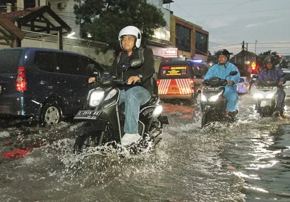 Ilustrasi pengendara sepeda motor menembus genangan banjir. (Robertus Risky/Jawa Pos)