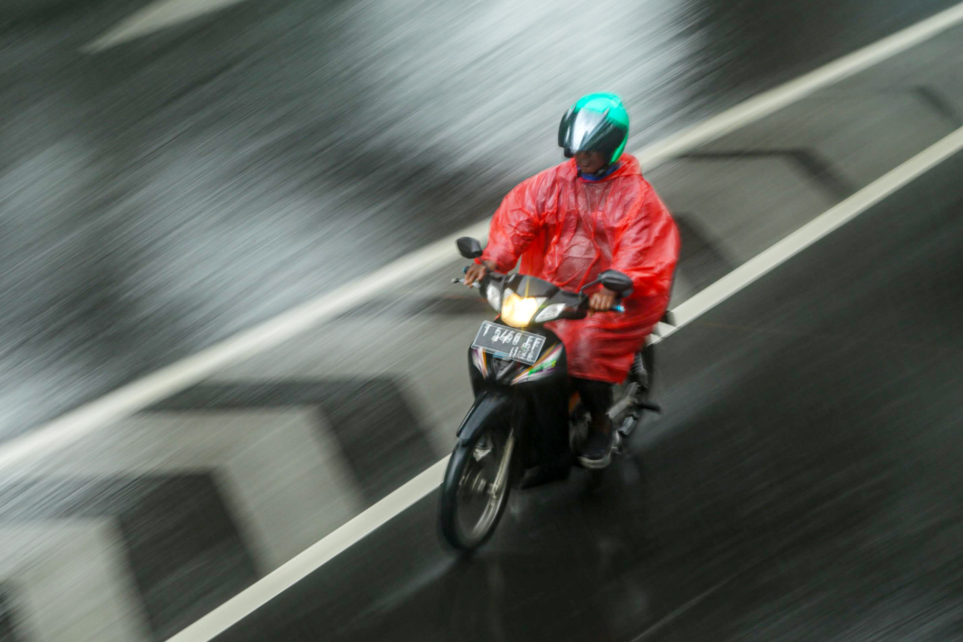 Jangan lupa juga untuk memakai helm yang sesuai, agar bisa melindungi kepala dan mata dari air hujan yang berpotensi mengganggu pandangan.