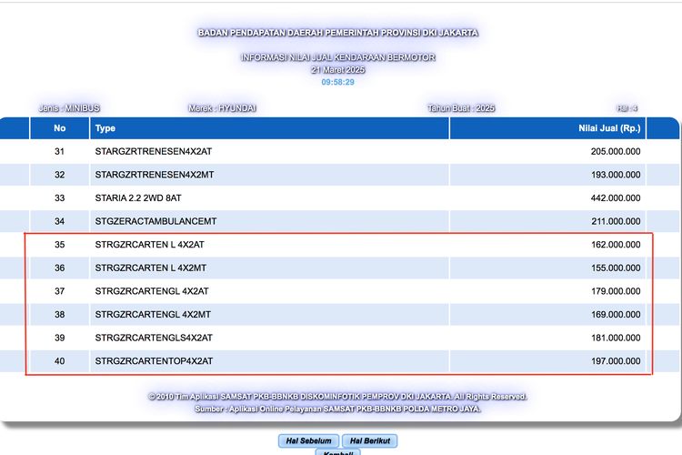 Bahkan dalam daftar tersebut terdapat enam trim STRGZRCARTEN yang didaftarkan oleh Hyundai dengan Nilai Jual Kendaraan Bermotor (NJKB) dimulai dari Rp155 juta sampai Rp 197 juta.