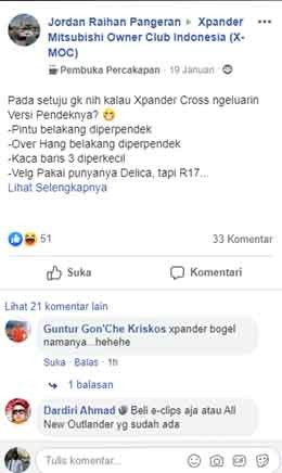 Dari postingan yang diunggah tersebut banyak menuai tanggapan, baik yang setuju maupun yang tidak setuju. Namun rata-rata para nitezen berpendapat kalau kemunculan Xpander Cross memang sengaja untuk memenuhi kebutuhan konsumen yang menginginkan mobil MPV rasa SUV dengan 7 penumpang. Atau bisa menampung banyak barang untuk berpetualang.