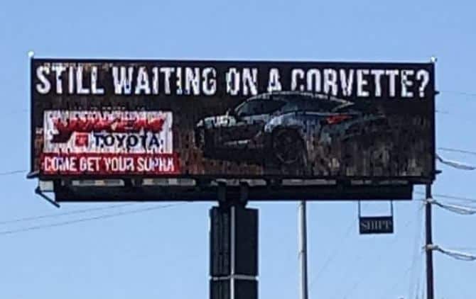 Seorang anggota di Forum Corvette baru-baru ini menemukan papan reklame dari dealer bertuliskan, ‘Masih menunggu di Corvette? Ayo ambil Supra Anda'.