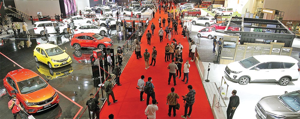 KEMBALI BERGULIR: Suasana hari pertama IIMS Hybrid 2021 di JIExpo Kemayoran, Jakarta, kemarin (15/4). Pameran otomotif itu berlangsung 15-25 April 2021. (MUHAMMAD ALI/JAWA POS)