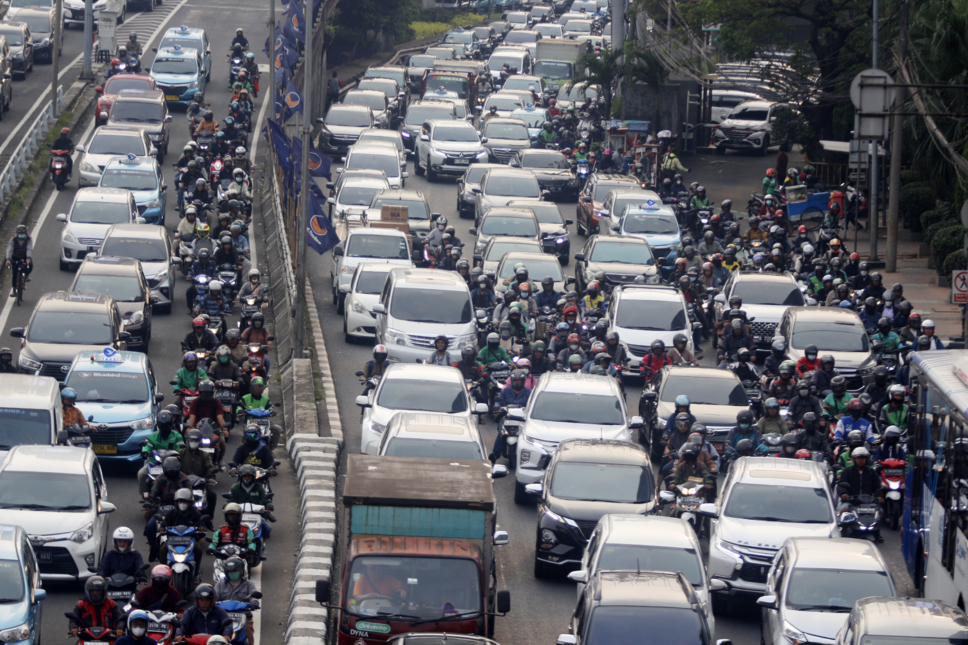 Kemacetan lalu lintas terjadi di kawasan Jalan Gatot Subroto, Kawasan Patra Kuningan, Jakarta Selatan.