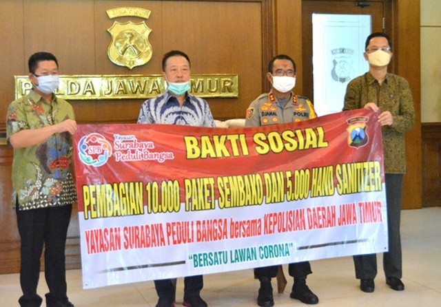 YSPB: Yayasan Surabaya Peduli Bangsa (YSPB) menyalurkan bantuan berupa 10 ribu paket sembako dan 5 ribu hand sanitizer kepada Polda Jatim untuk dibagikan kepada warga terdampak Covid-19. Ketua YSPB Sanjaya Utomo menyerahkan bantuan tersebut secara simbolis kepada Wakapolda Jatim Irjen Pol Djamaluddin di Mapolda Jatim Jumat (22/5). Sanjaya mengungkapkan, bantuan tersebut diharapkan mampu meringankan beban masyarakat yang terdampak Covid-19. (den/c6/agm)