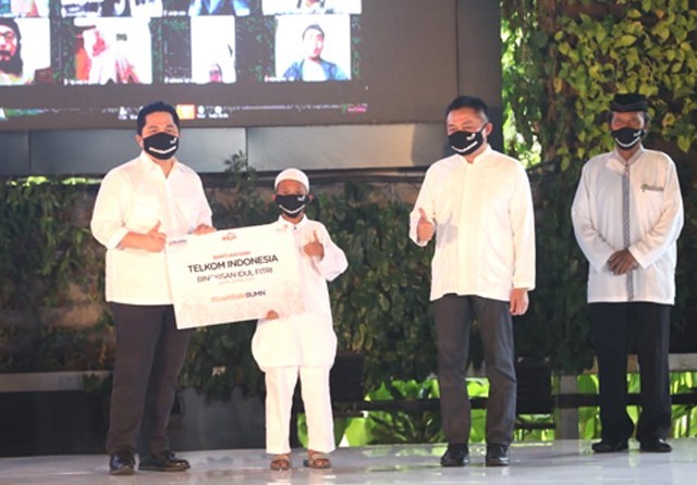 TELKOM GROUP: Menteri BUMN Erick Thohir secara simbolis menyerahkan paket bantuan PT Telkom Indonesia (Persero) Tbk kepada perwakilan masyarakat, diikuti dengan penyerahan bantuan secara serentak di 7 lokasi kantor Telkom regional pada Rabu (20/5). Yakni, Medan, Jakarta, Bandung, Semarang, Surabaya, Balikpapan, dan Makassar. Sebanyak 100.000 paket bantuan dibagikan kepada masyarakat terdampak Covid-19. Di antaranya, berupa sembako, takjil buka puasa, dan bingkisan Lebaran yang disiapkan dengan memberdayakan 1.300 UMKM binaan Telkom.
