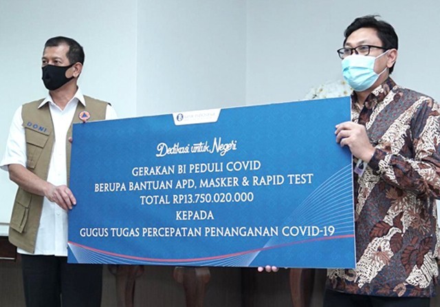 BI: Bank Indonesia (BI) melalui Dedikasi untuk Negeri menyerahkan bantuan senilai total Rp 13,75 miliar kepada Gugus Tugas Percepatan Penanganan Covid-19 kemarin (27/5). Bantuan tersebut diharapkan mampu meringankan beban tenaga medis yang bertugas.