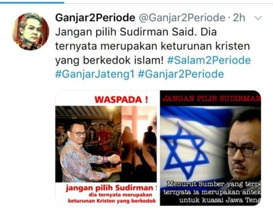 Akun @ganjar2periode itu sendiri, sebelumnya diketahui telah mengunggah sebuah foto bergambar Sudirman Said, berlatar belakang bendera Israel dan disertai kicauan, “Jangan pilih Sudirman Said. Dia ternyata merupakan keturunan kristen yang berkedok islam!".