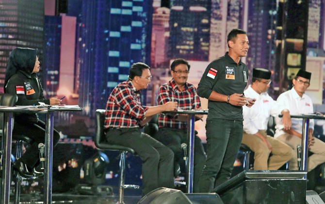 Ketiga pasangan calon gubernur DKI saat debat calon yang diselenggarakan KPU DKI Jakarta, Jumat pekan lalu.