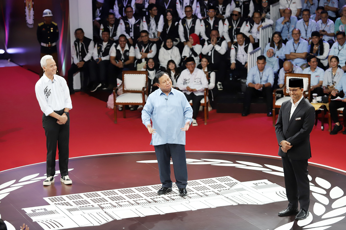 Capres nomor urut 1 Anies Baswedan, Capres nomor urut 2 Prabowo Subianto dan Capres nomor urut 3 Ganjar Pranowo berpegangan beradu gagasan dalam debat perdana Capres dan Cawapres 2024 di Gedung KPU, Jakarta, Selasa (12/12/2023).