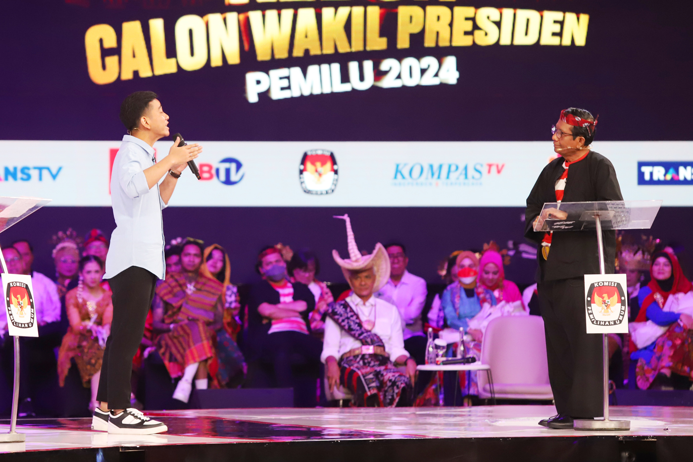 Calon wakil presiden nomor urut 2 Gibran Rakabuming Raka dan Calon wakil presiden nomor urut 3 Mahfud MD beradu argumen saat debat calon wakil presiden Pemilu 2024 di JCC, Jakarta, Jumat (22/12/2023).